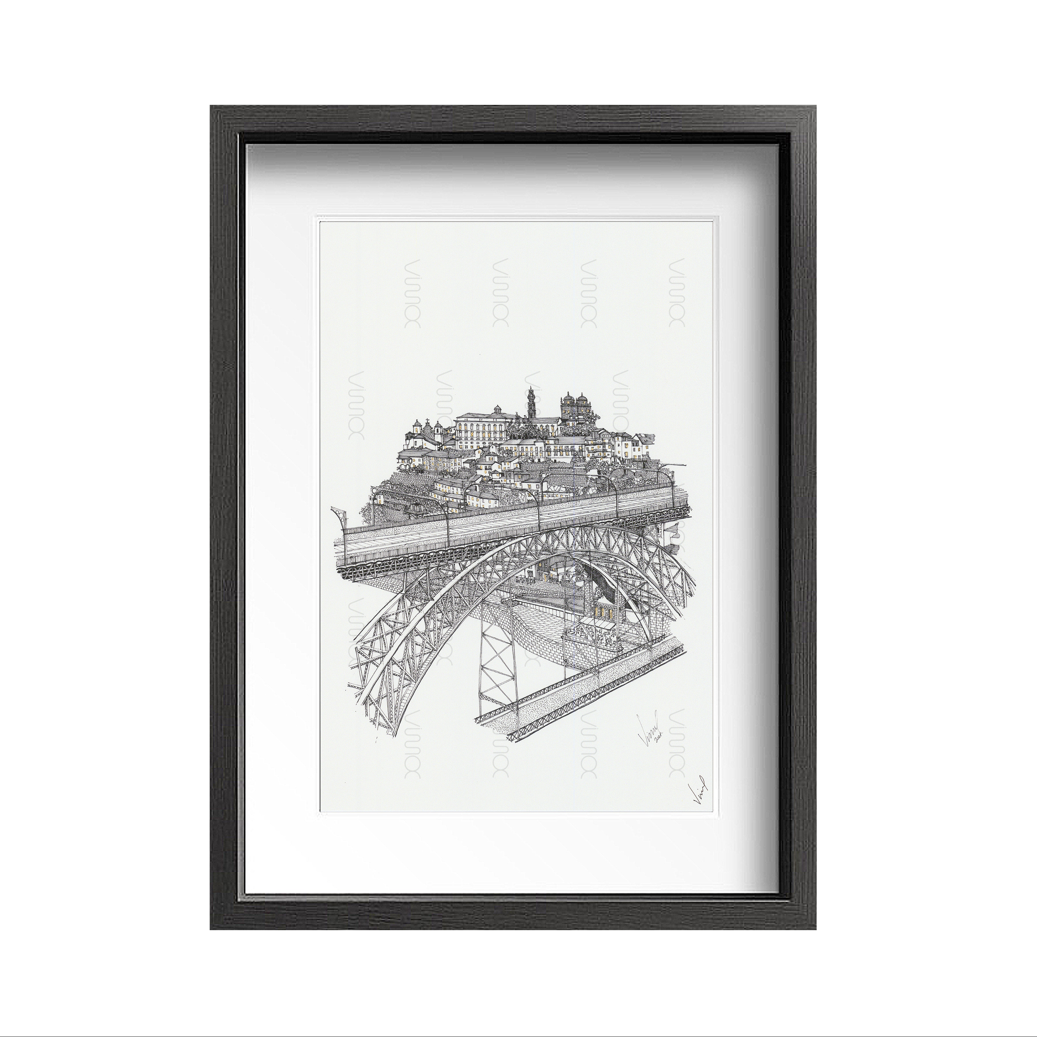 Porto City illustration on 100% cotton Fine Art radiant White paper with manual application of gold leaf, signed and with white stamp. * Frame not included