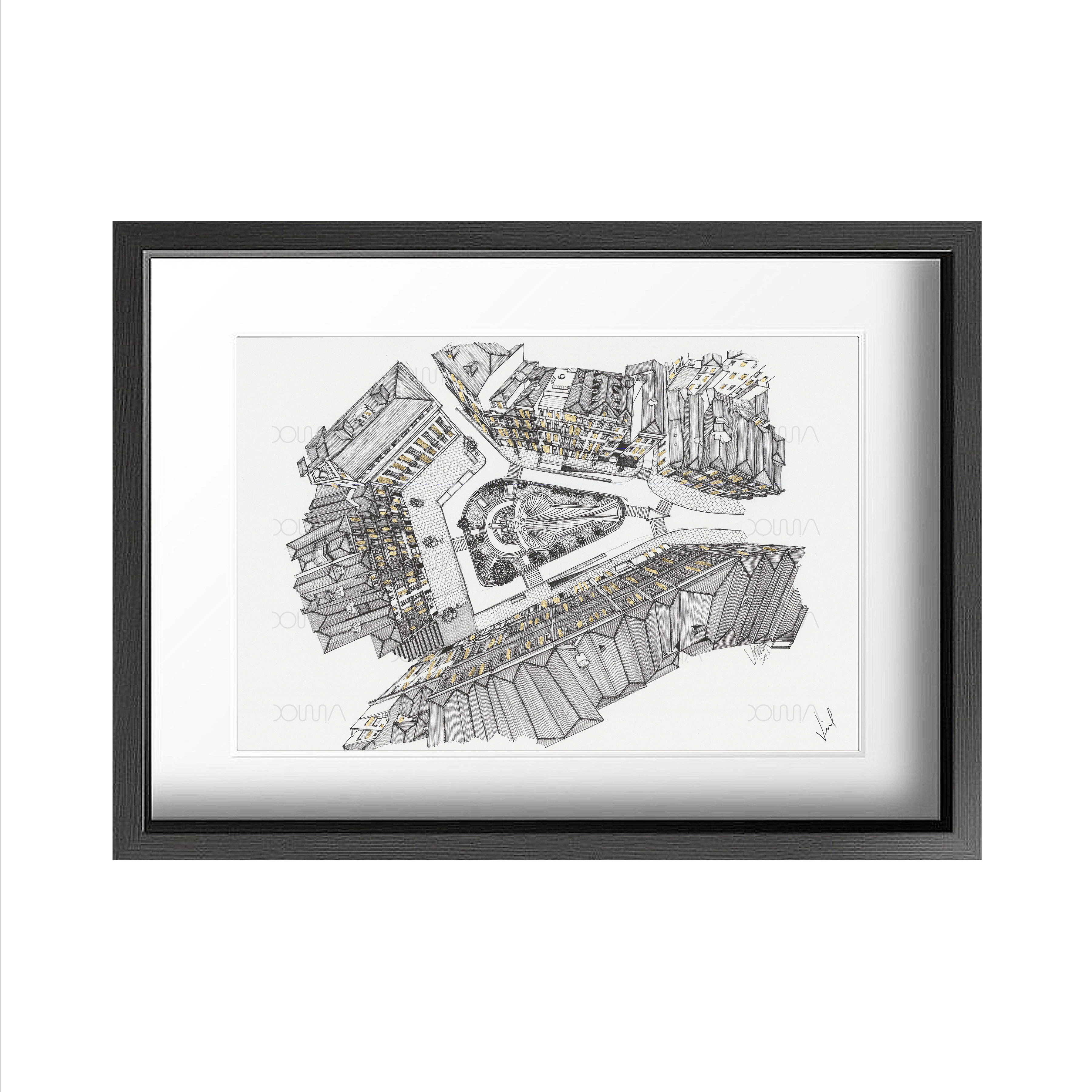 Porto City illustration on 100% cotton Fine Art radiant White paper with manual application of gold leaf, signed and with white stamp. * Frame not included